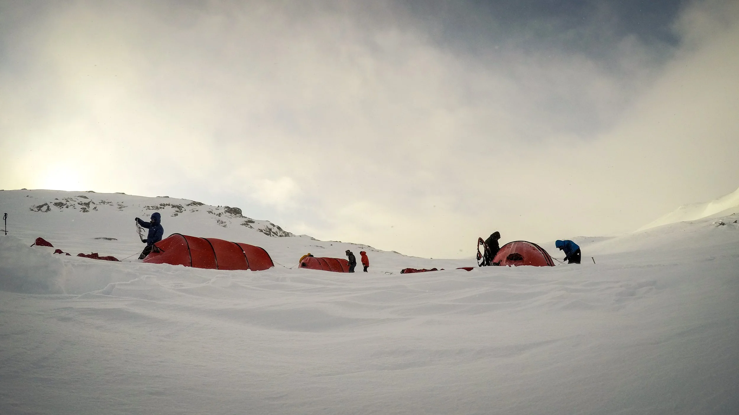 We usually work on a simple rhythm: ski or snowshoe for 1 hour, rest for 10–15 minutes, repeat. After a few cycles, we take a longer break for lunch, then carry on. Tents are Hilleberg Keron 3GTs and we use a specific setup technique to protect against wind. In strong weather we build protective walls, double up poles in each sleeve, and pile snow around the base. Cold air wells are dug at tent entrances, and the stove gets fired up quickly to melt snow for drinking and cooking.