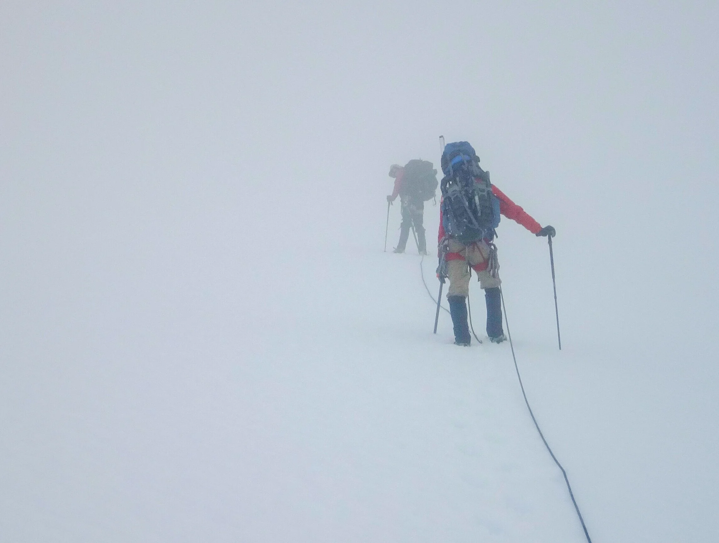 • Winter skills: You must be comfortable using crampons, ice axes, and moving as part of a roped team on glaciated ground. Familiarity with crevasse rescue techniques is strongly recommended.